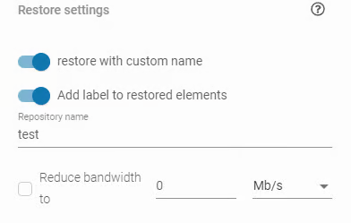 In **Restore settings** you can set a custom name for the repository that will be created during the restore process and limit the internet bandwidth.