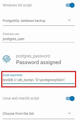 pg_dump_dir - path to the pg_dump utility. This parameter is required only for Windows-hosted PostgreSQL database IMPORTANT! Specifying the port is optional. If you do not specify a port in the arguments, the default port will be used.