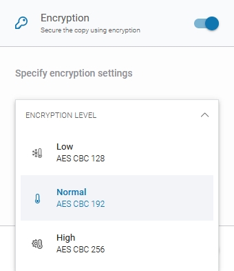 Encryption is recommended when working with sensitive data. Xopero ONE secures backups using the AES encryption algorithm.