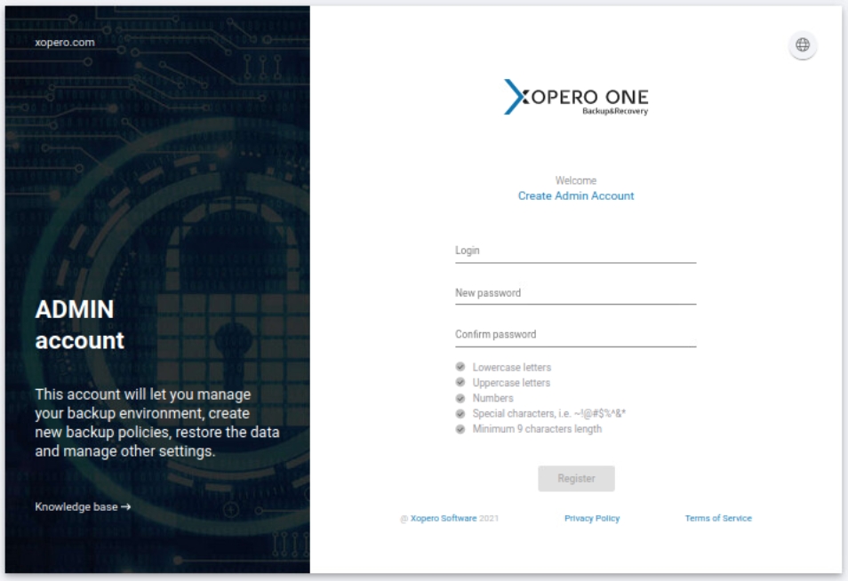 When you launch the Management Service for the first time, you will be prompted to create an administrator account. To register a valid admin account you have to provide your login (it has to be a valid email address) and create a password compliant with the Xopero password policy.