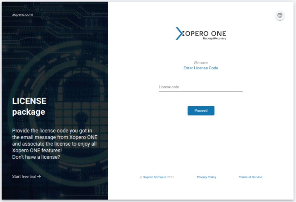 Having the administrator account registered, you will then be asked to provide a license key (which you should've received via email upon registering for Xopero ONE)— this is the last step before the Xopero ONE system becomes operational and ready to use. Once done, click Proceed to go to the system setup.