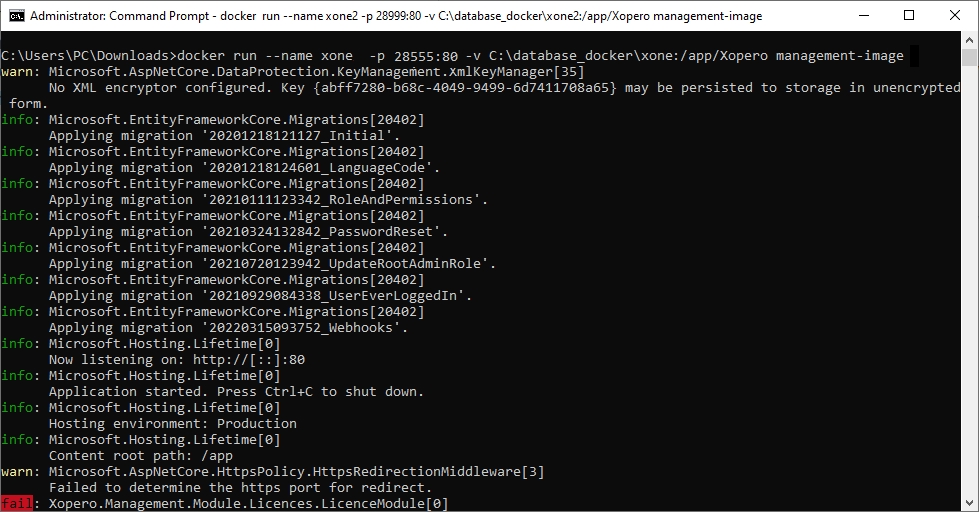 In the above command, replace drive_location_database with the location to mount the database on (from the container to the local directory)— this is important for upgrading the container later. In place of container_name, enter the name of your container and in place of service_port, enter the service port which will be used by Xopero ONE (by default, XMS port is set to 28555).