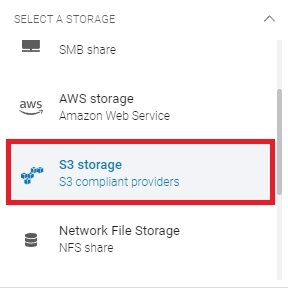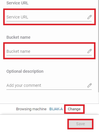 After selecting storage option, the system will display additional sections, including: Authentication data, Service URL, Bucket name, and Optional description.