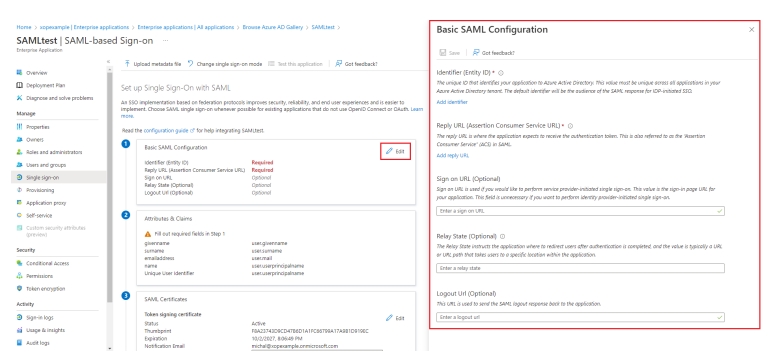 Click the Edit button in ① Basic SAML Configuration section to edit it.