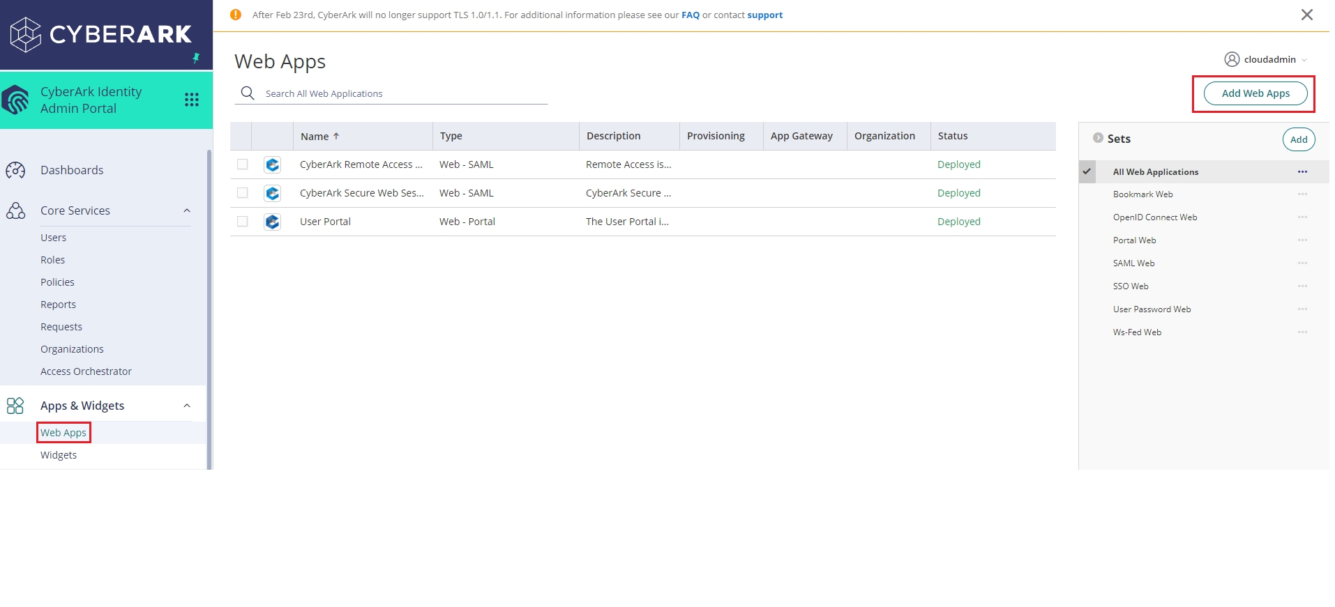 Log in to your CyberArk account. Expand Apps & Widgets dropdown menu and select Web Apps.
