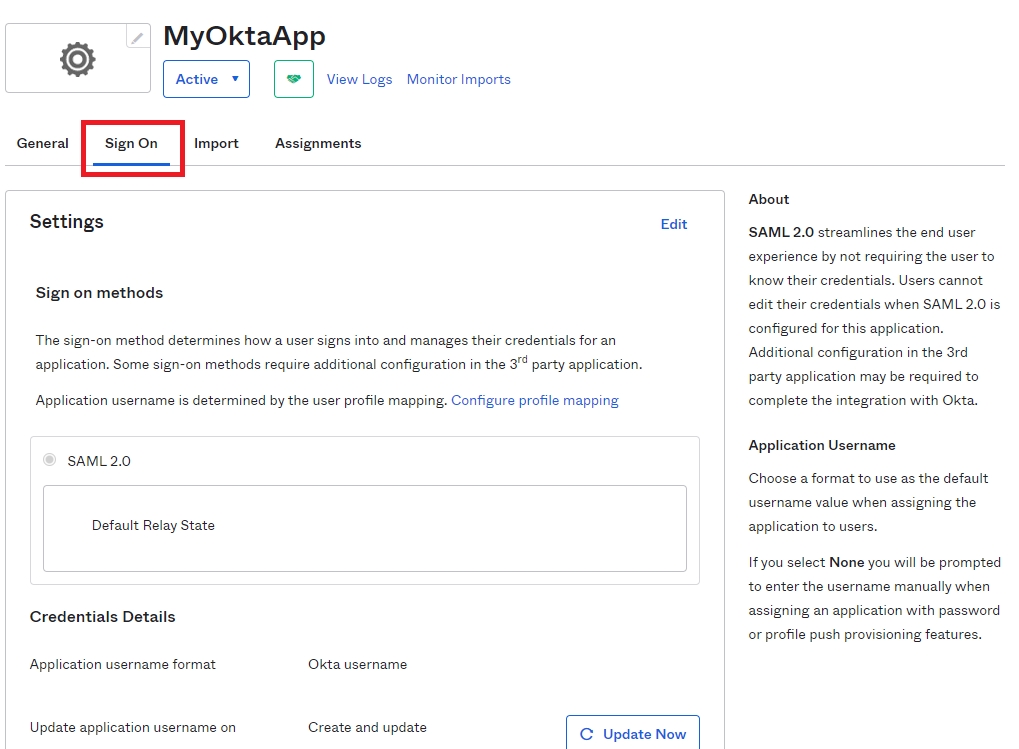 Entity ID: should be the same name you've set in General Settings in Okta (in this example it's MyOktaApp)