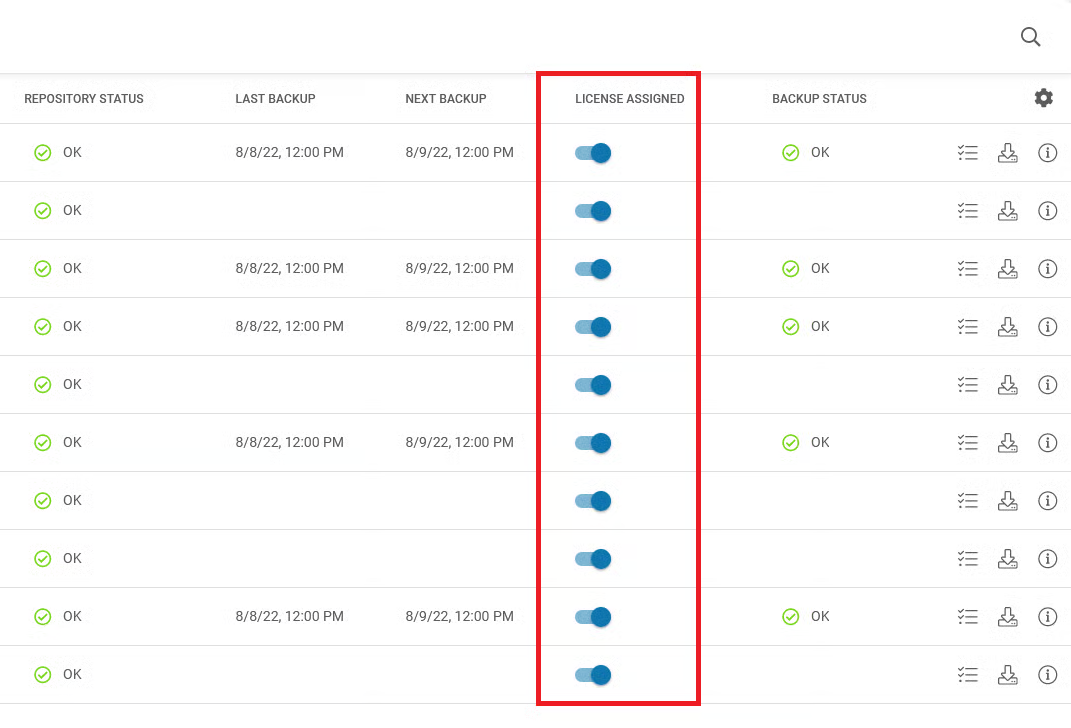To enable or disable licenses for your repositories, open the relevant dashboard (i.e., **GitHub**) and click **Explore** button in the right-bottom corner of the organization tile. Here, you can manage all your repositories and enable or disable protection by assigning a license. In the **License assigned** column, use the toggle button to turn the protection on or off.