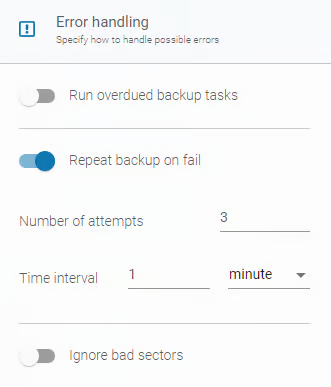 2. **Repeat backup on failure** — you can define the number of times a backup task should be retried in case of an error, as well as the time interval between each retry.