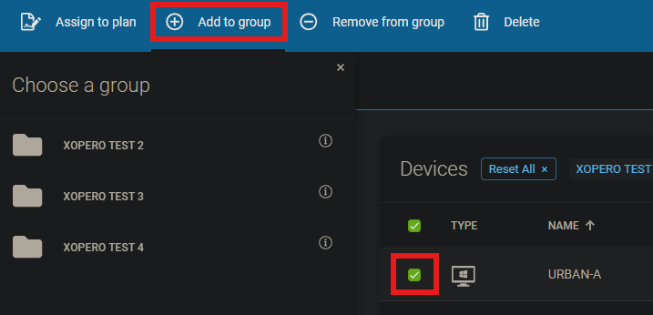 To add a device to a group, select one or more devices and click the <img src="https://319733277-files.gitbook.io/~/files/v0/b/gitbook-x-prod.appspot.com/o/spaces%2F0CBTl43C3OO6ySL1DJ6k%2Fuploads%2F3IQ4twaW36zfh0ZrtjbM%2Fimage.png?alt=media&#x26;token=bf010361-3022-4c86-80f3-ec68222371e5" alt="" data-size="line"> **Add to group** button in the top menu, then choose the group you want to assign the devices to.
