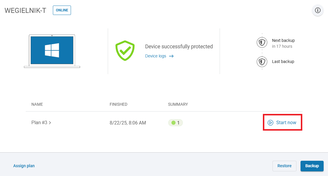 In all relevant **device dashboard** views, simply click the <img src="https://319733277-files.gitbook.io/~/files/v0/b/gitbook-x-prod.appspot.com/o/spaces%2F0CBTl43C3OO6ySL1DJ6k%2Fuploads%2FyrwG4UsaxAbUCP468Hsh%2Fimage.png?alt=media&#x26;token=5ba99b85-458b-4b32-b90a-61454d1f283c" alt="" data-size="line"> <mark style="color:blue;">**Start now**</mark> (**device view**) or **start** <img src="https://319733277-files.gitbook.io/~/files/v0/b/gitbook-x-prod.appspot.com/o/spaces%2F0CBTl43C3OO6ySL1DJ6k%2Fuploads%2FJhzqSwnSjXWfBW9tkjuZ%2Fimage.png?alt=media&#x26;token=ab05409a-af78-4cee-9386-72960fed3c56" alt="" data-size="line"> button (**list view**) to run a backup task manually.