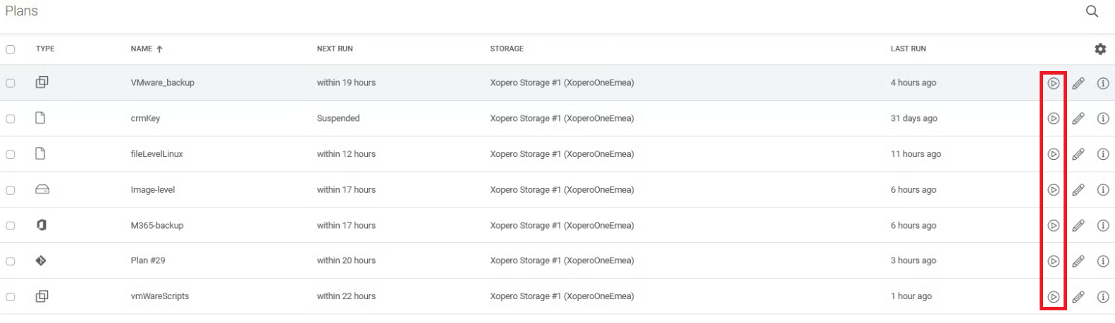 Alternatively, you can open the **Plans** tab to see a list of all backup plans and trigger a backup task directly from there using the **start** <img src="https://319733277-files.gitbook.io/~/files/v0/b/gitbook-x-prod.appspot.com/o/spaces%2F0CBTl43C3OO6ySL1DJ6k%2Fuploads%2FS3wp9U1EEoB7l0AcZdxf%2Fimage.png?alt=media&#x26;token=58481ea0-bd42-43aa-82af-b0999514eec3" alt="" data-size="line"> button.&#x20;