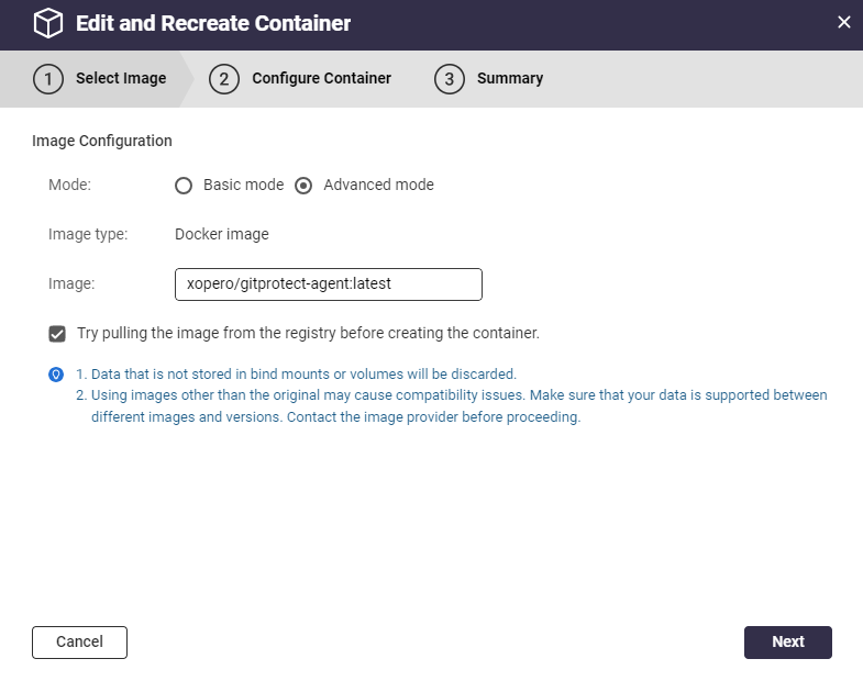 Upewnij się, że zaznaczona jest opcja Try pulling the image from the registry before creating the container (gwarantuje to użycie najnowszej wersji). Kliknij Next aby kontynuować.