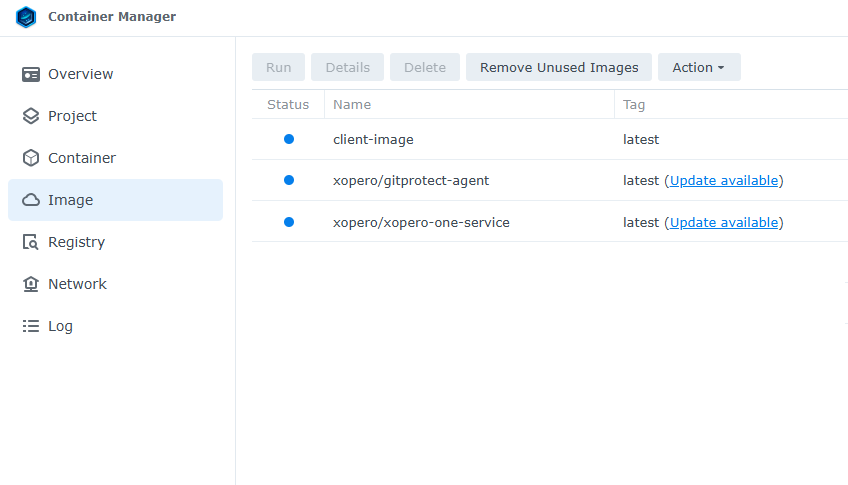 :latest, narzędzie Container Manager monitoruje dostępność aktualizacji obrazu. Gdy nowa wersja będzie dostępna, w zakładce Image, pojawi się powiadomienie ze statusem Update available. Aby rozpocząć proces aktualizacji, wystarczy kliknąć przycisk Update available..