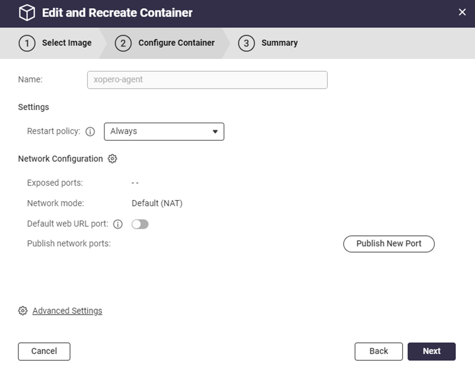 Możesz teraz edytować ustawienia kontenera. Dostosuj je w razie potrzeby i kliknij Next, aby przejść do podsumowania.