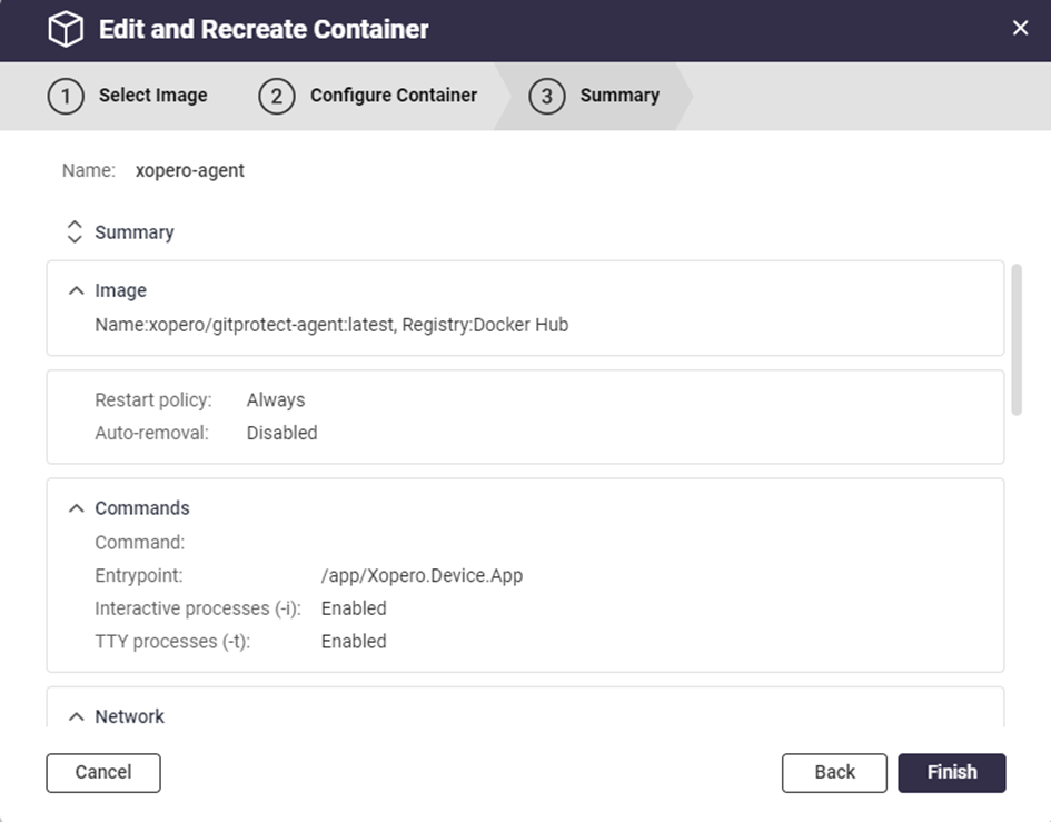 Sprawdź podsumowanie zmian. Jeśli wszystko się zgadza, kliknij Finish. Container Station pobierze najnowszy obraz i utworzy nowy kontener, zachowując dane i ustawienia poprzedniego. To aktualizuje agenta do najnowszej wersji zachowując poprzednie ustawienia i dane.