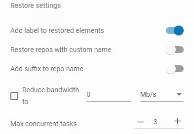 W Ustawieniach przywracania możesz ustawić własną nazwę dla repozytorium, które zostanie utworzone podczas procesu przywracania i ograniczyć przepustowość łącza. Możesz użyć przełączników, aby włączyć lub wyłączyć dostępne opcje, takie jak dodanie etykiety do przywróconego elementu.