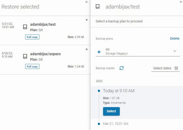 Kliknięcie na pojedyncze repozytorium spowoduje wyświetlenie panelu bocznego, w którym możesz wybrać plan backupu i wersję backupu do przywrócenia. Kliknij Wybierz pod wybraną kopią backupu, aby kontynuować.