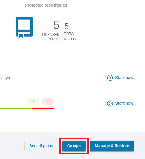 Otwórz kartę GitLab (DevOps > GitLab), a następnie kliknij przycisk Grupy obok organizacji, której backup chcesz przywrócić.