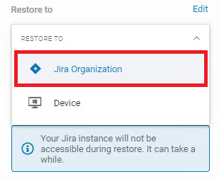 Następnie wybierz opcję Organizacja Jira z menu rozwijanego Przywracanie do.