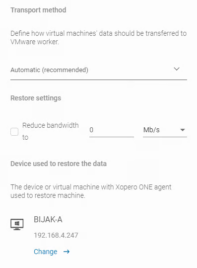 Cała maszyna — ta opcja przywraca całe dane maszyny do VMware z backupu. Wybranie tej opcji pozwala wybrać metodę transportu: Automatyczna (zalecana), HotAdd, lub LAN. Możesz również ograniczyć przepustowość sieci dla operacji przywracania.