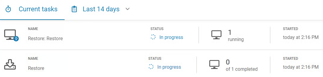 Zapisz plan i poczekaj na jego uruchomienie zgodnie z harmonogramem, lub kliknij Zapisz i uruchom, aby rozpocząć go natychmiast. Aktywne zadania przywracania testowego możesz monitorować w karcie Zadania.