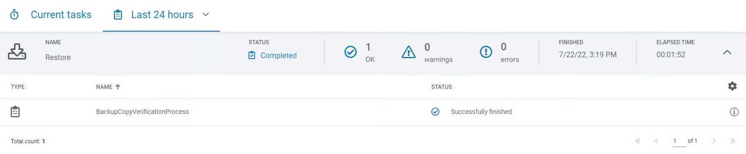 Możesz zweryfikować poprawność zakończonego zadania przywracania testowego w karcie Zadania.