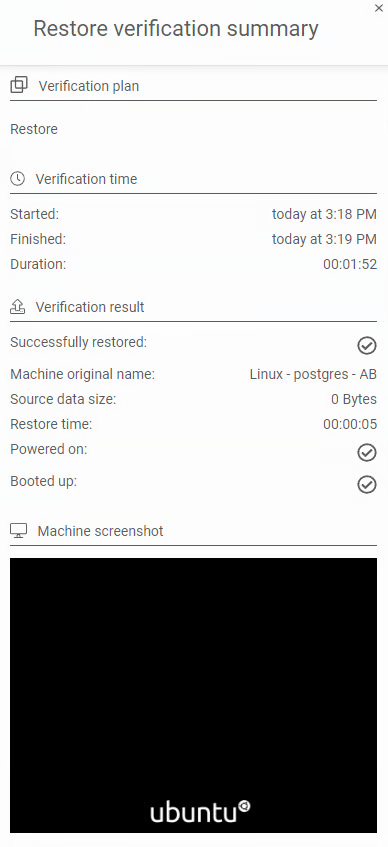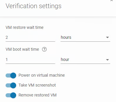 W sekcji Weryfikacja możesz zdefiniować, jak długo system ma czekać podczas przywracania i uruchamiania maszyny wirtualnej (proces uruchamiania komputera i ładowania systemu operacyjnego po przywróceniu). Możesz także włączyć opcje zasilania maszyny wirtualnej, wykonania zrzutu ekranu po uruchomieniu w celu weryfikacji i usunięcia maszyny po pomyślnym przywróceniu.