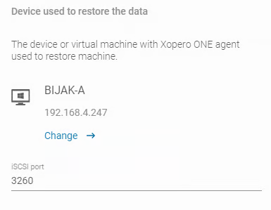Przywracanie natychmiastowe — przywraca maszynę za pomocą zamontowanych dysków, które działają bezpośrednio z backupu (za pośrednictwem iSCSI). Ta metoda pomija wysyłanie danych, czyniąc ją znacznie szybszą. Określ urządzenie i port, aby udostępnić zasób poprzez cel iSCSI.