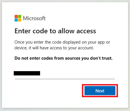 Wprowadź skopiowany kod i kliknij Dalej (Next), aby kontynuować.