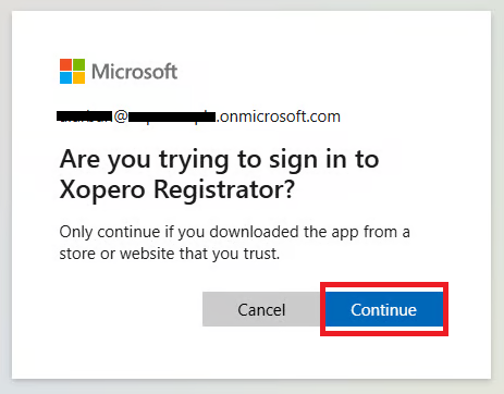 Potwierdź logowanie do Xopero Registrator, klikając Kontynuuj (Continue).