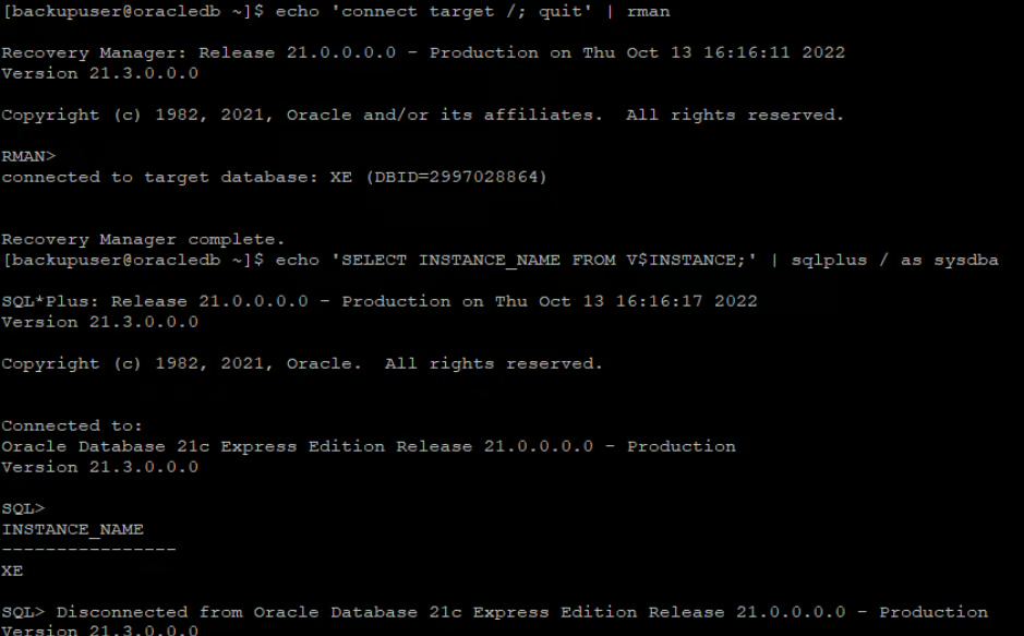 echo 'connect target /; quit' | rmanecho 'SELECT INSTANCE_NAME FROM V$INSTANCE;' | sqlplus / as sysdba