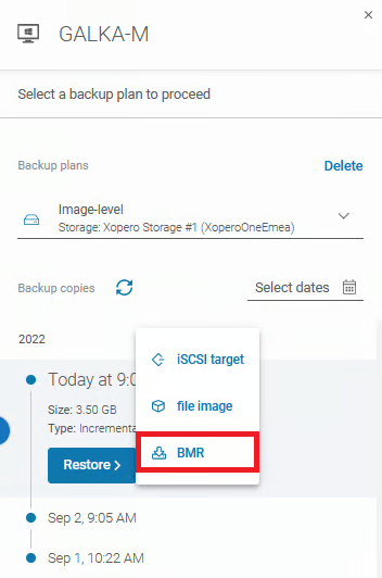 Wybierz znacznik czasu, z którego chcesz przywrócić dane, kliknij przycisk Przywróć, następnie wybierz opcję przywracanie BMR z menu rozwijanego.