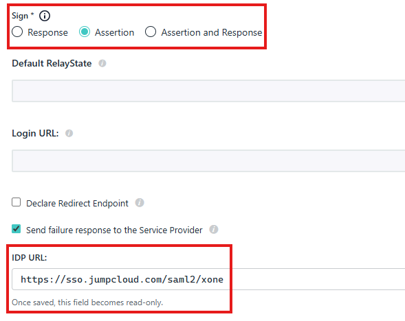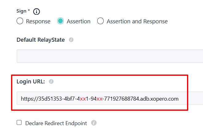 W sekcji Sign wybierz Assertion. Adres IDP URL powinien wyglądać następująco: