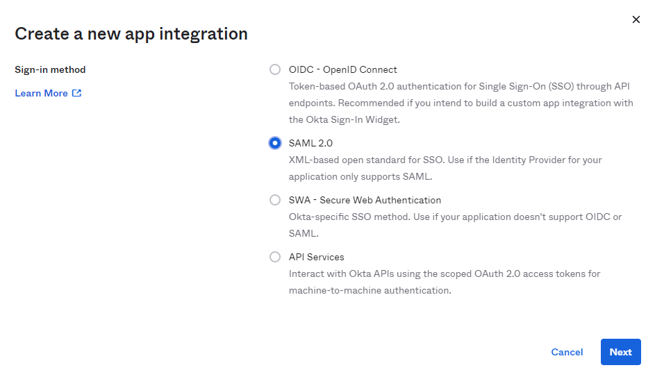 Kliknij przycisk Create App Integration i wybierz SAML 2.0.