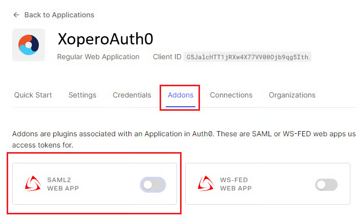 Przewiń z powrotem na górę i otwórz zakładkę Addons następnie przełącz przycisk SAML2 WEB APP.