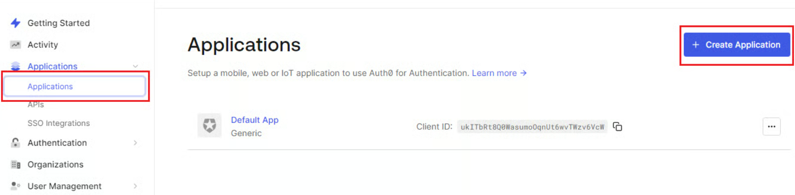 Otwórz swój dashboard w Auth0, przejdź do Dashboard > Applications > Applications, następnie kliknij przycisk Create Application w prawym górnym rogu ekranu.