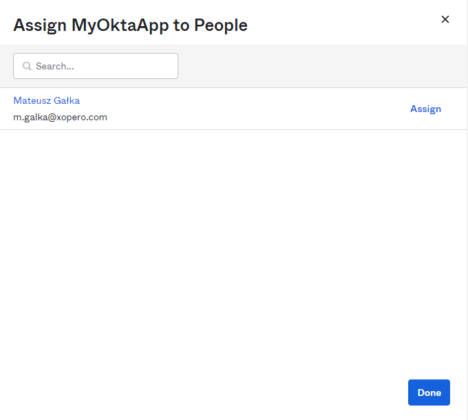 Przypisz aplikację do wybranego użytkownika lub grupy. Kliknij Done, aby zakończyć konfigurację.