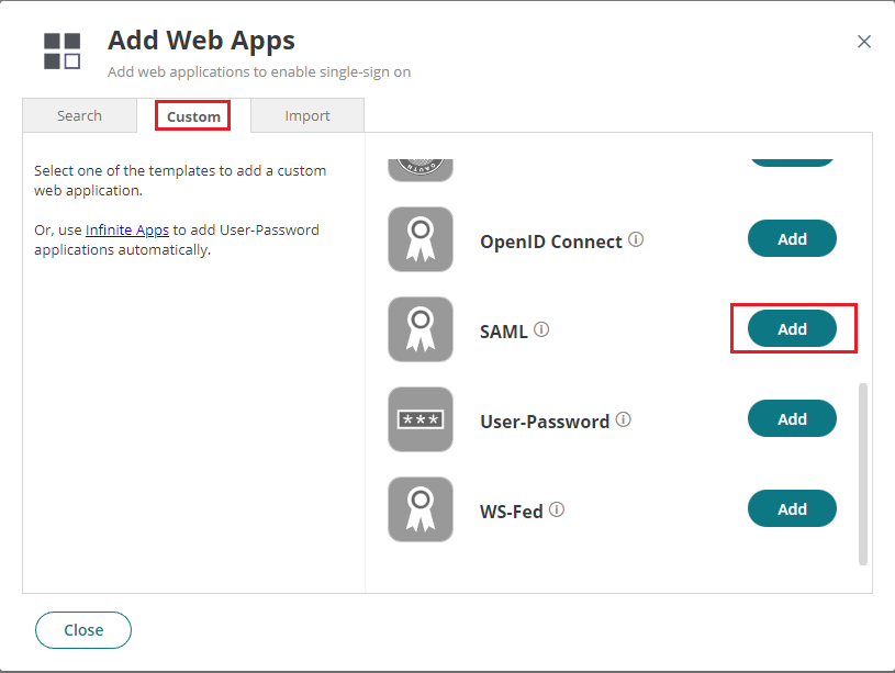 Przejdź do zakładki Custom, znajdź na liście SAML, a następnie kliknij przycisk Add, obok SAML.