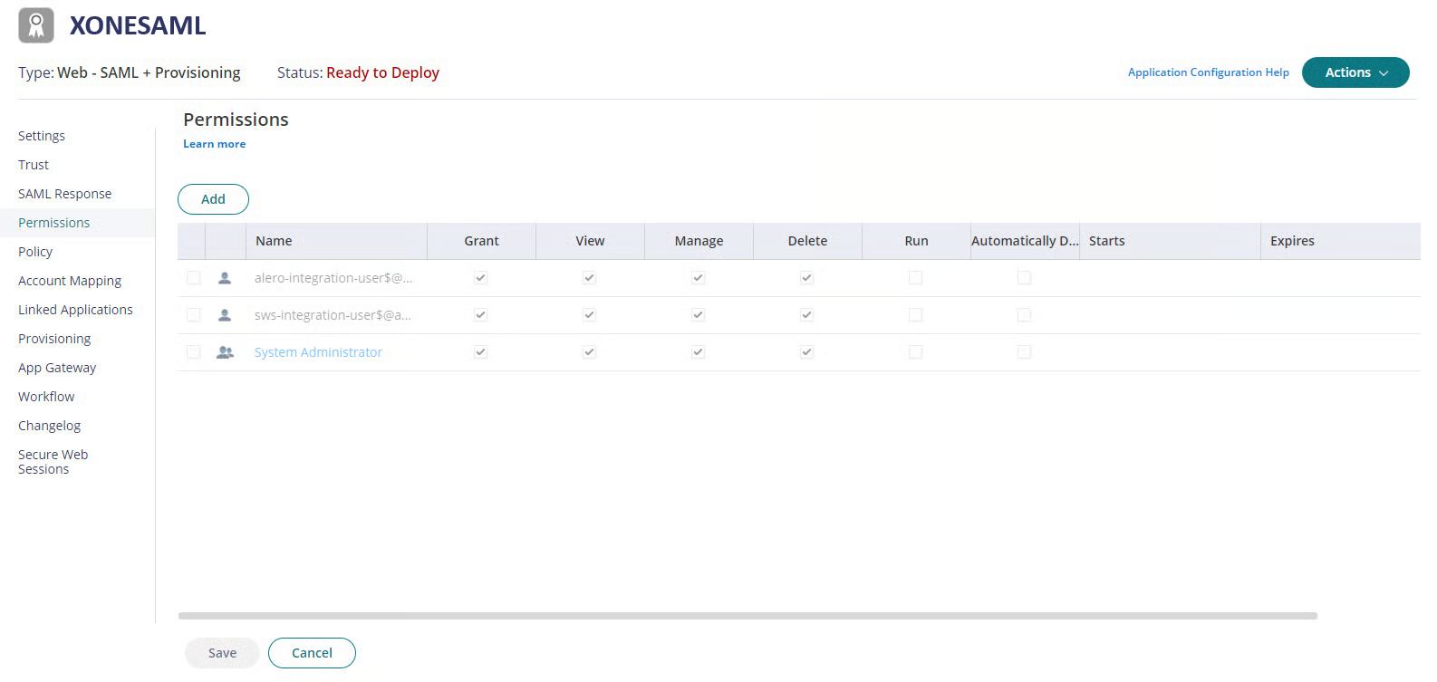 Udaj się do zakładki Permissions, kliknij przycisk Add, wybierz wszystkich użytkowników, których chcesz autoryzować do używania integracji SAML, następnie Zapisz swoje ustawienia.