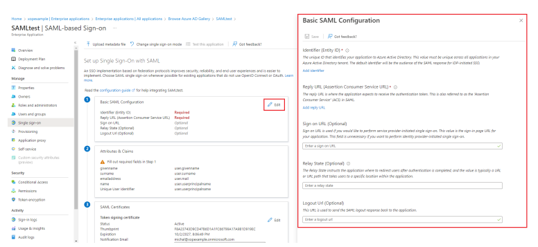 Kliknij przycisk Edit w sekcji ① Basic SAML Configuration aby ją edytować.