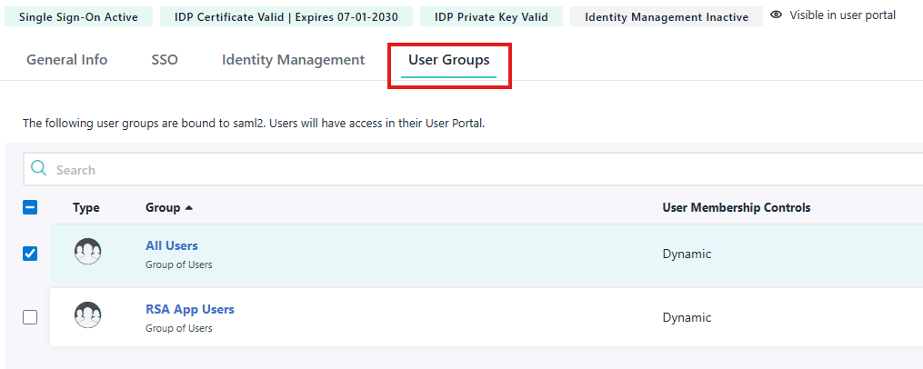Kliknij Save, aby zaktualizować konektor i przejdź do karty User Groups. Wybierz grupy/użytkowników, dla których chcesz włączyć autoryzację JumpCloud SAML przy logowaniu do Xopero ONE.