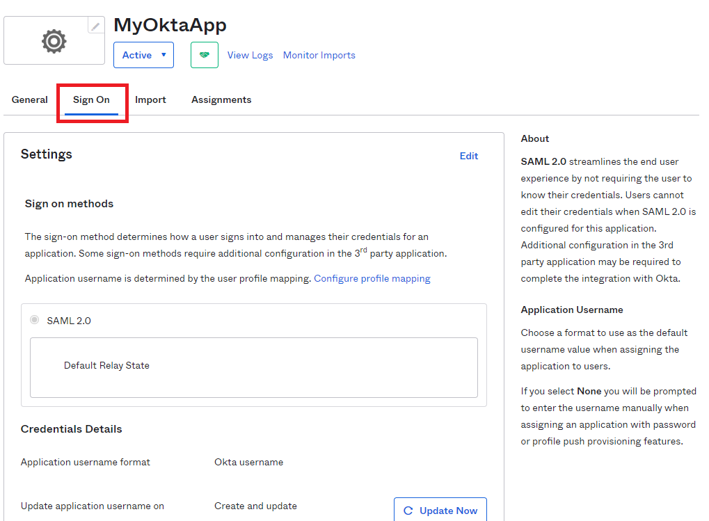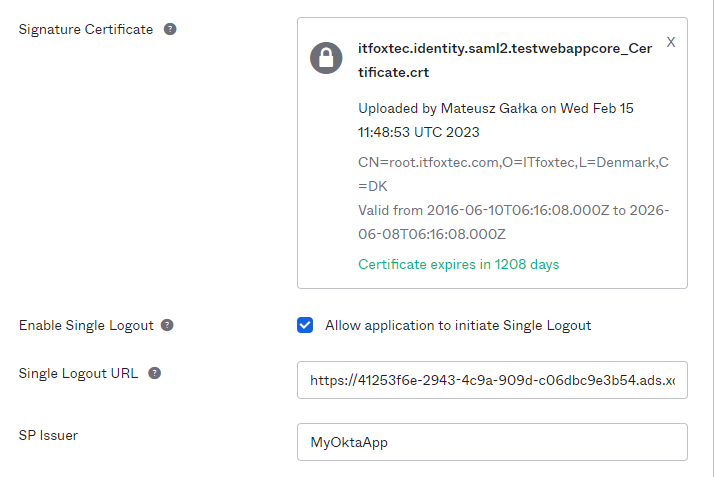 SP Issuer: unikalna nazwa aplikacji ustawiona wcześniej w General Settings (w tym przykładzie: MyOktaApp).
