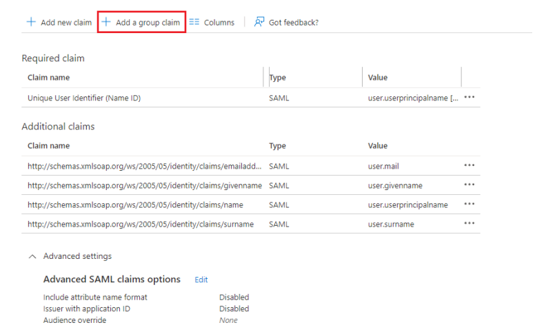 Następnie kliknij przycisk Edit w sekcji ② Attributes & Claims i naciśnij przycisk ➕Add a group claim.