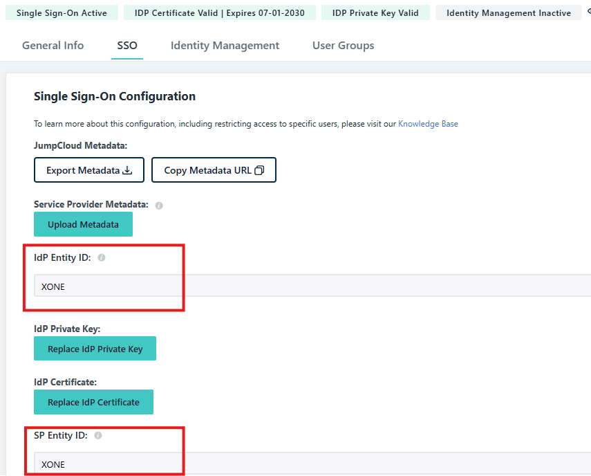Entity ID: powinien być taki sam, jak nazwa ustawiona w SSO IDP Entity ID w JumpCloud (w tym przykładzie: XONE).