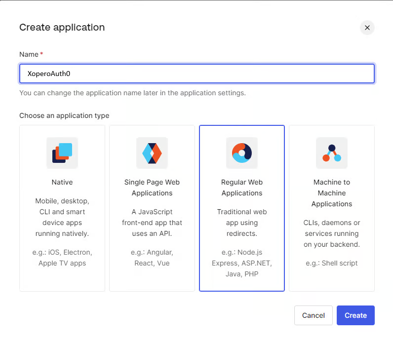 W oknie Create application wprowadź unikalną, własną nazwę aplikacji (w tym przykładzie użyjemy XoperoAuth0), wybierz opcję Regular Web Applications i kliknij Create:
