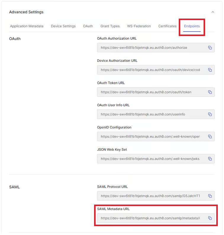 Przejdź do zakładki Endpoints i znajdź sekcję SAML . Skopiuj SAML Metadata URL i zapisz na później — będzie potrzebny do konfiguracji Xopero ONE.