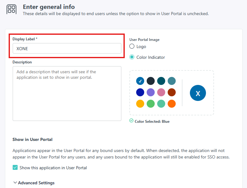 W sekcji Enter general info ustaw unikalną nazwę aplikacji (w tym przykładzie użyjemy XONE), wpisz ją w polu Display Label i kliknij Save Application.