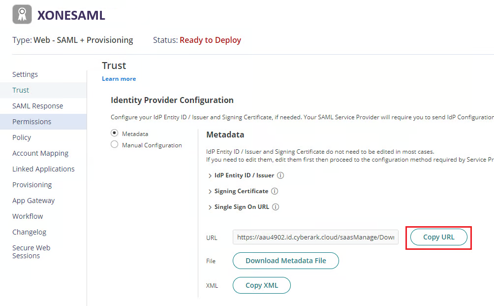 Otwórz zakładkę Trust i skopiuj Metadata URL w sekcji Identity Provider Configuration (będzie później potrzebny do konfiguracji Xopero ONE).