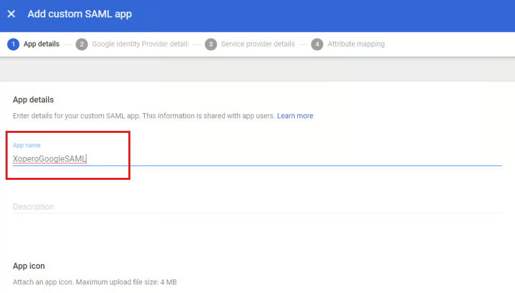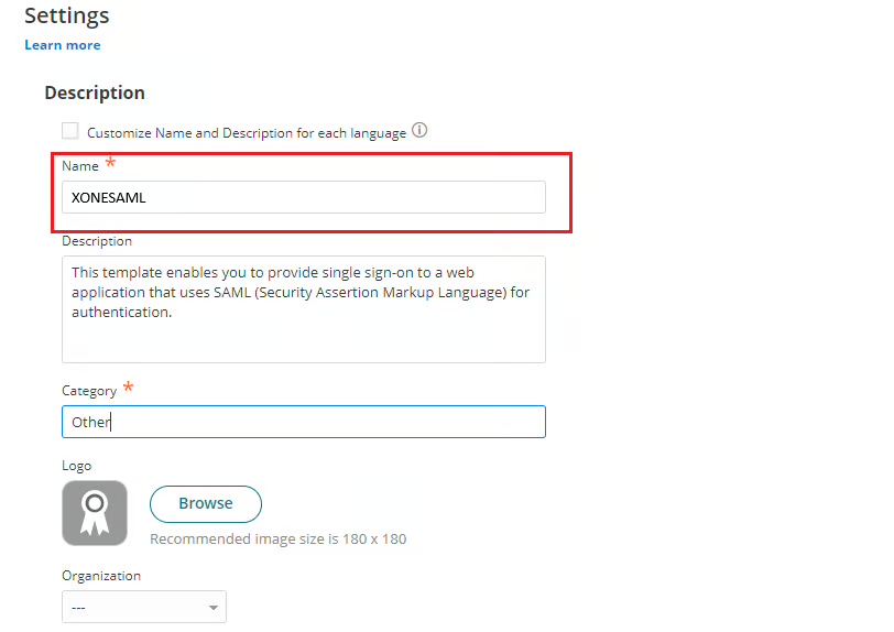 Zostaniesz przekierowany do ustawień aplikacji sieciowej SAML. Zacznij od ustawienia własnej nazwy dla aplikacji (np. XONESAML).