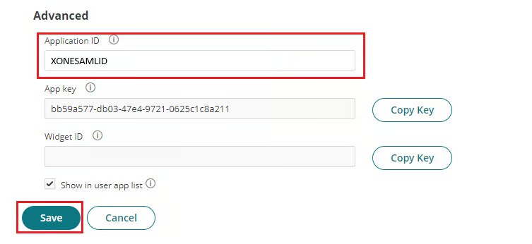 Następnie ustaw unikalny Application ID w sekcji Advanced i Zapisz swoje ustawienia (w tym przykładzie użyjemy XONESAMLID).